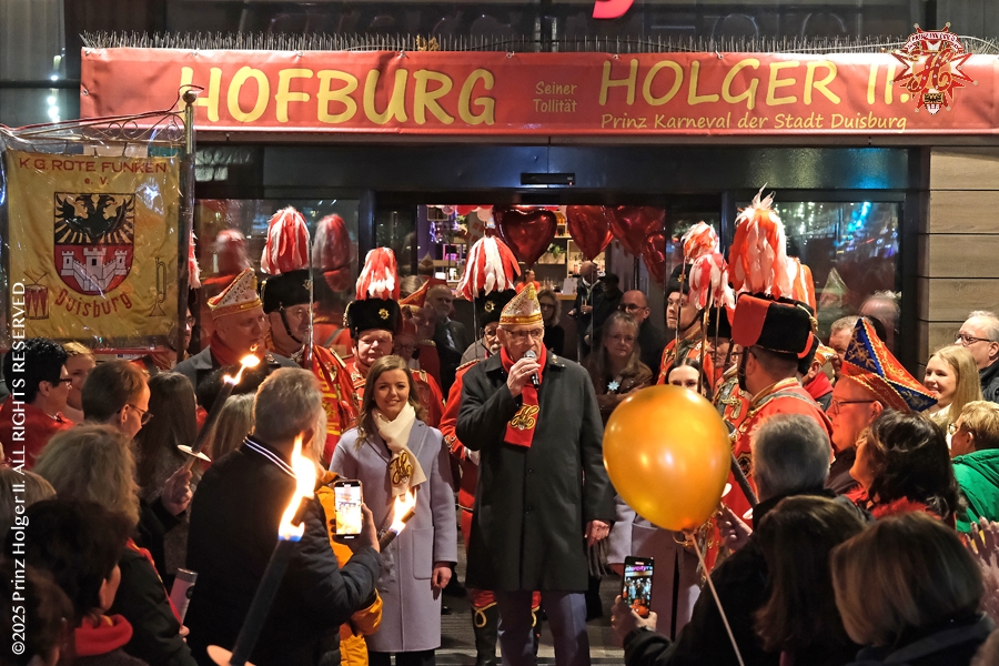 24 Einzug in die Hofburg - 17. Januar 2025, ein kühler Abend vor dem IntercityHotel am Duisburger Hauptbahnhof. Wir begrüßten die anwesenden Gesellschaften vor der Tür mit anschließender Fahnenhissung. Danach gab es ein feucht fröhliches Miteinander im Restaurant und an der Bar.