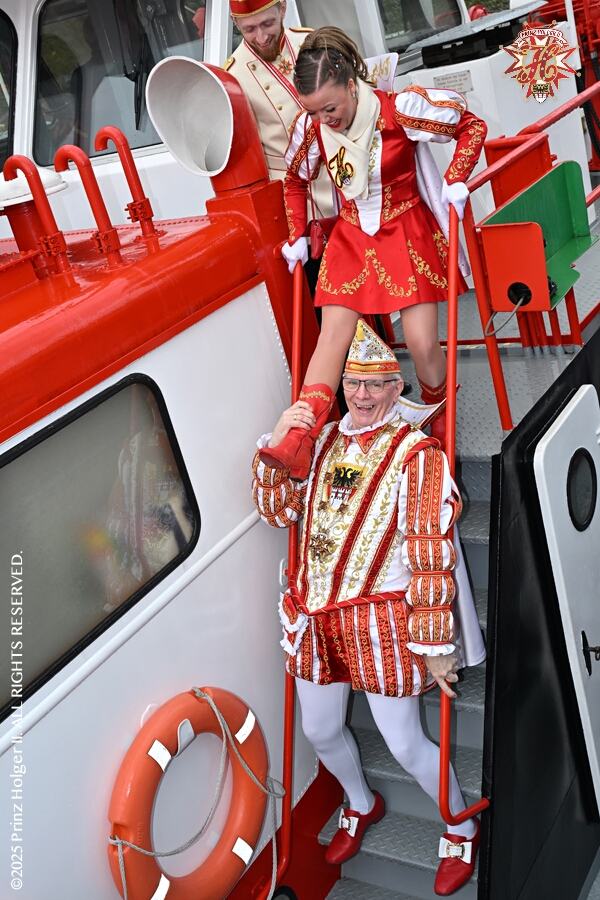 24 Prinzenfahrt auf dem duisport-Schiff - Die Prinzenfahrt auf dem duisport-Schiff, der Karl Jarres ist ein Höhepunkt in jeder Session! Pünktlich um 11:11 Uhr hieß es „Leinen los". Zusammen mit duisport-Vorstand Markus Bangen und Giordana Sperling-Doppstadt sowie Vertretern des HDK. Auch Vertreter aus Duisburgs Karnevalsgesellschaften waren an Bord und es ging volle Kraft voraus über den Rhein.
