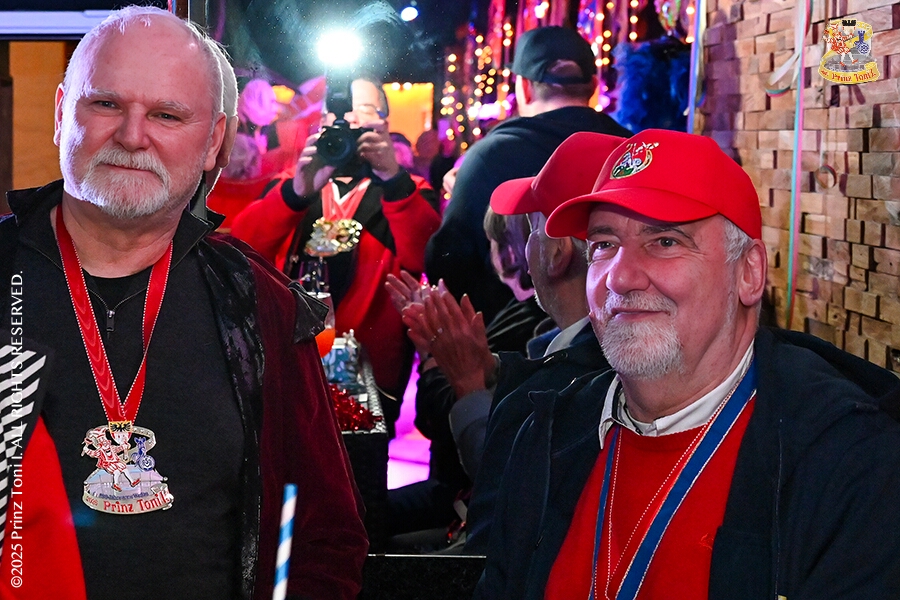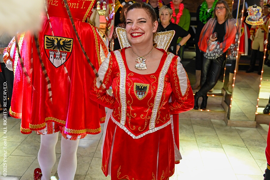 25 Tour-Tag, 1. Februar - Im Intercity Hotel feierten die Roten Funken ihr 77-jähriges Bestehen an diesem Sonntagmorgen, auch wir gratulierten. Auf zum Heimspiel für unsere Christin hieß es danach, dies bei der Damensitzung der » Blauen Jungs «. Eine große Kinderschar erwartete uns dann im Steinhof. Die Musketiere hielten dort ihre Kindersitzung ab. In die Rheinhausenhall führte uns dann der nächste Termin, Damensitzung von Rot-Weiß. Zum Schluß erwartete und die SPD Großenbaum/Rahm bei ihrem „Tanztee“ in unserem Stadquartier, dem Coupe 1900.