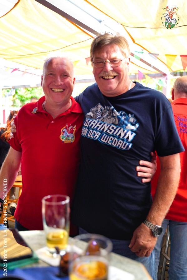 20 30. August, 4 mal Sommerfest - Das „Garde-Grillen“ der Duisburger Prinzengarde ist unser erstes Ziel an diesem Samstag in Duisburg-Meiderich. Danach geht es in den Süden Duisburgs, zur KG Sonniger-Süden. Auf ein kurzes Hallo geht es dann zur KG Rote Funken am Kalkweg. Von dort führt uns der Weg in den Westen Duisburgs. Die 1. KG Baerl Blau-Gelb e.V. feiert ihr Sommerfest auf dem Gelände des TUS Baerl. Das Heimspiel für Hofmarschall Thomas, dem Präsidenten der KG.