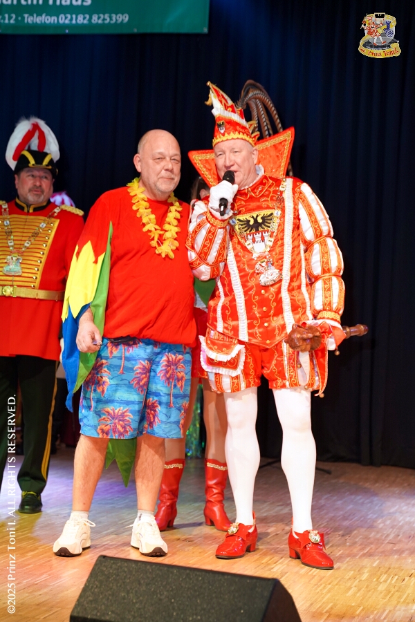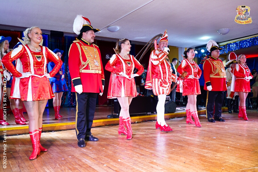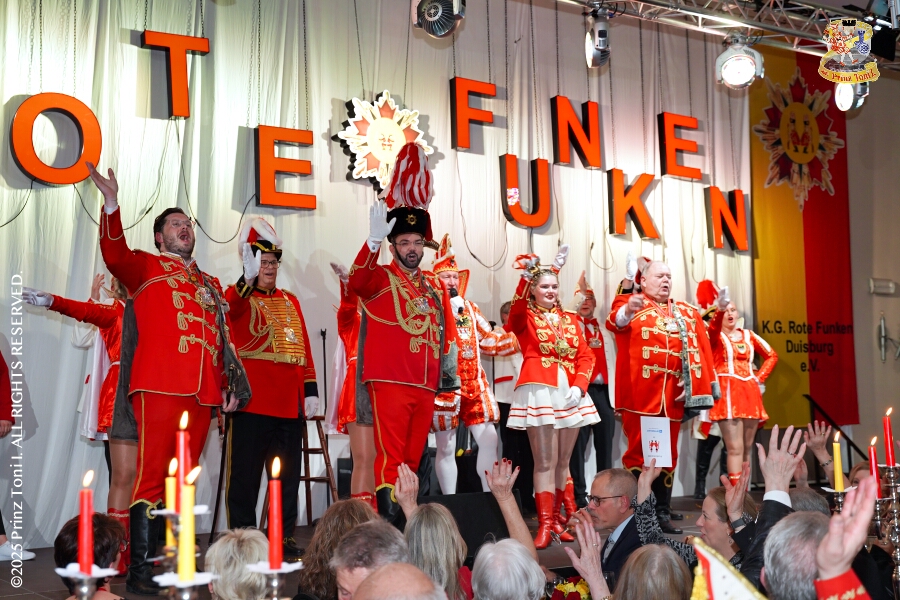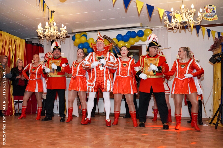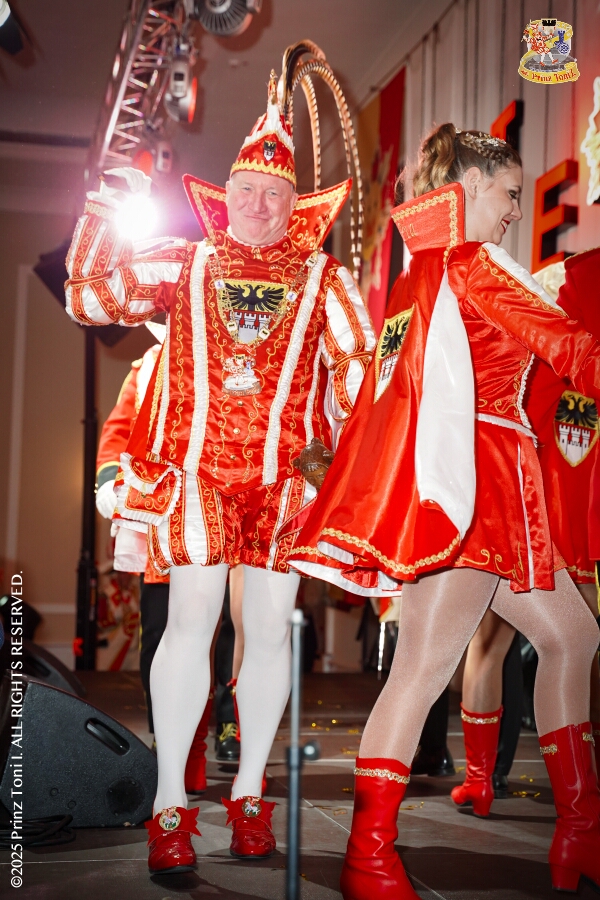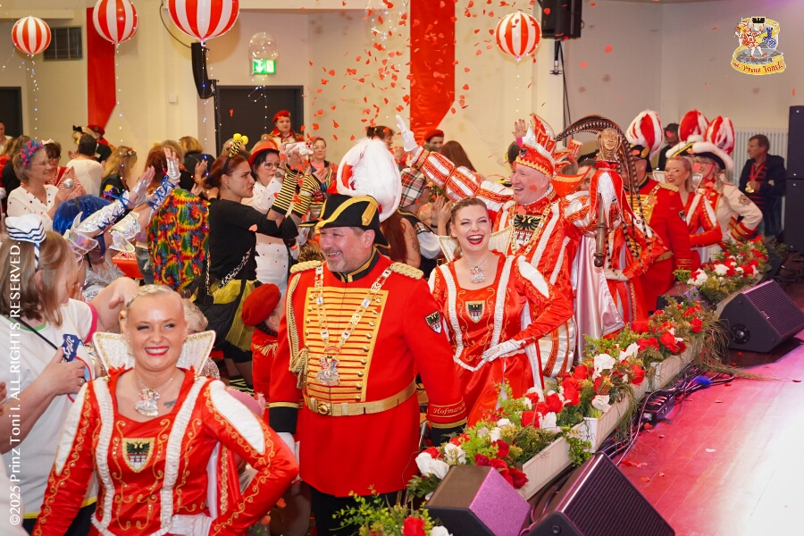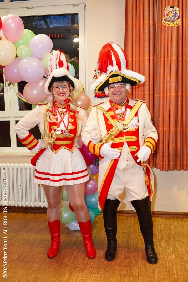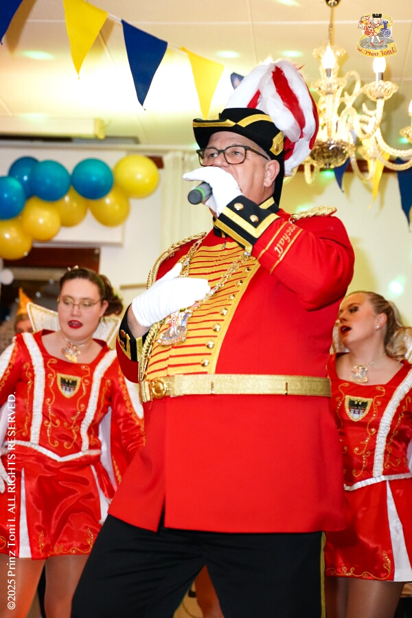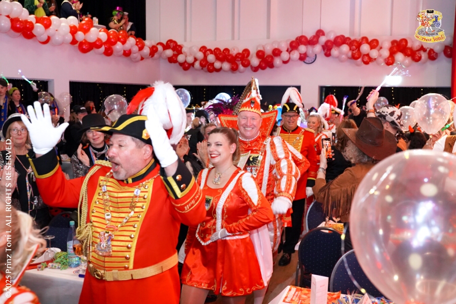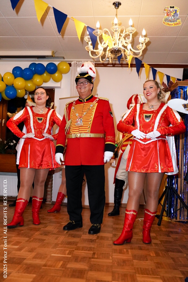 25 Tour-Tag, Samstag 24. Januar - Kurz vor 18 Uhr starten wir mit unserem Programm bei der Feier der AWO im Gemiendehaus Erlenstraße. Dann geht es zu Thomas Heimspiel, der „Kostümball“ der 1. KG Baerl im Waldhof. Als nächster Termin steht die „Damensitzung“ der KVO in der Clauberghalle auf dem Plan. Von dort geht es zurück in die City. Erst ins WYNDHAM Hotel Duisburger Hof zum „Funkenball“ der Roten Funken, nebenan dann im Landfermann Gymnasium „Damensitzung“ der Prinzengarde. Danach ins Gertrud-Bäumer-Berufskolleg zur „Mädchensitzung“ der Stadtgarde. Kurz über die A 59 nach Meiderich, hier ist die „Jeckenparty“ der Meidericher Jecken. Wieder Richtung Süden, mit Stop in der Falkstraße zur „Prunksitzung“ vom Sonnigen Süden, dann weiter nach Serm zur Prinzenkürung. Hatte auch etwas von Heimspiel für Pia und Toni.