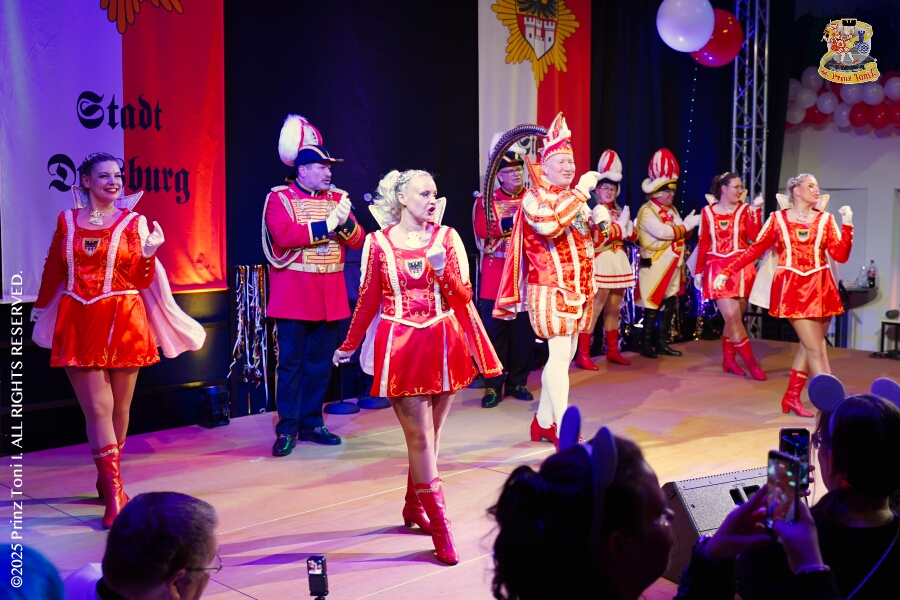 Kurz vor 18 Uhr starten wir mit unserem Programm bei der Feier der AWO im Gemiendehaus Erlenstraße. Dann geht es zu Thomas Heimspiel, der „Kostümball“ der 1. KG Baerl im Waldhof. Als nächster Termin steht die „Damensitzung“ der KVO in der Clauberghalle auf dem Plan. Von dort geht es zurück in die City. Erst ins WYNDHAM Hotel Duisburger Hof zum „Funkenball“ der Roten Funken, nebenan dann im Landfermann Gymnasium „Damensitzung“ der Prinzengarde. Danach ins Gertrud-Bäumer-Berufskolleg zur „Mädchensitzung“ der Stadtgarde. Kurz über die A 59 nach Meiderich, hier ist die „Jeckenparty“ der Meidericher Jecken. Wieder Richtung Süden, mit Stop in der Falkstraße zur „Prunksitzung“ vom Sonnigen Süden, dann weiter nach Serm zur Prinzenkürung. Hatte auch etwas von Heimspiel für Pia und Toni.